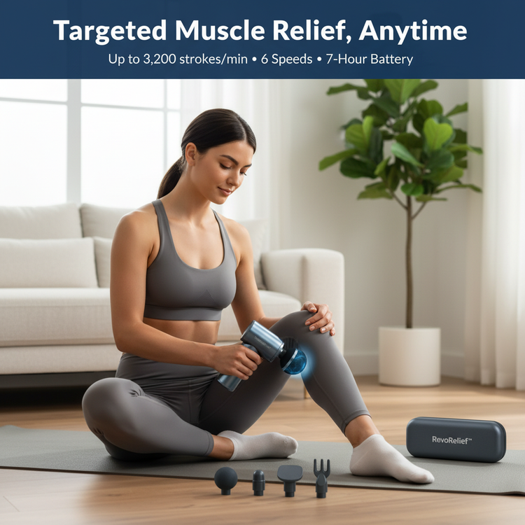 The RevoRelief™ Massage Gun delivers up to 3,200 strokes per minute across six adjustable speeds, featuring four interchangeable heads to target all muscle groups. Its brushless motor ensures near-silent operation, making it perfect for home, gym, or office use.